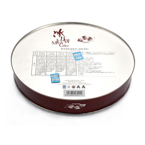 此款橢圓形中秋月餅鐵盒產(chǎn)品在印刷工藝方面,使用了四色與專色印刷工藝制作,內(nèi)外表面處理為過光油。鐵盒作有透鐵效果處理,使得鐵盒整體具有的金屬質(zhì)感。