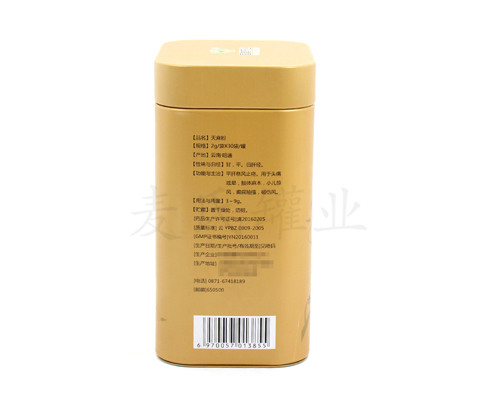 金色天麻粉鐵罐包裝,其印刷工藝為單面四色膠印,作有蓋、身、底印刷處理,而罐身整體為過水性亮光油,蓋、底過有高亮效果的金油。您還可選擇過爆炸油、皺紋油、珠光油等不同的外觀效果。鐵罐的規(guī)格尺寸為97*77*155mm。可包裝60克左右的天麻粉產(chǎn)品。